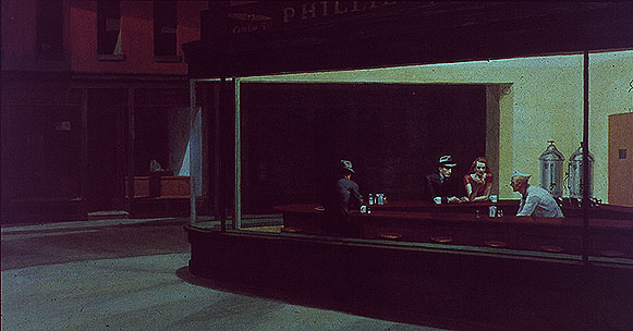 The hotel symbolized for James the very stuff of human restlessness, defying any margin of personal stability. A similar theme is at work in Hopper's pictures. To return for a moment to Thomas Hovenden's painting, Breaking Home Ties, Hopper's hotels and rented rooms are the antonyms and antitheses of such homes: home ties, once broken, are not repaired.